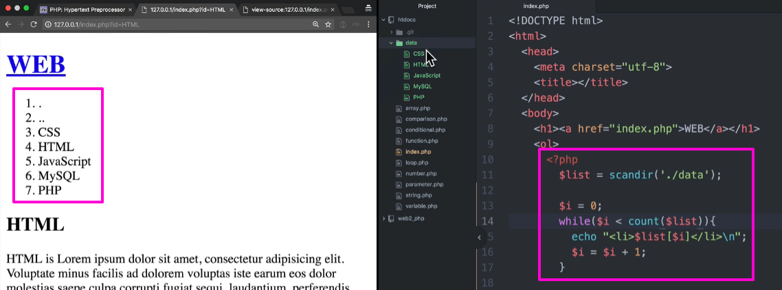 echo "<li>$list[$i]</li>\n"; --> \n은 줄바꿈 명령임
